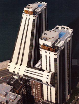 Chicago beheimatet unglaublich interessante Architektur. Ein Gebäude in der Heimatstadt von Frank Lloyd Wright erreichen zu können, bleibt manchen europäischen Architekten wohl ein Traum. Einige davon, wie Mies van der Rohe, konnten dieser Stadt sogar ihren Charakter verleihen. So erfüllte ich mir diesen Traum, obwohl ich gar kein Architekt bin, kaufte ein älteres Hochhaus am Lake Shore Drive und werde nun das Objekt nach meinen Bedürfnissen umbauen. Zwei Swimming Pools zu besitzen, ist eines davon – eines mit Süsswasser und ein Jodbad. Ich musste nach einer statischen Lösung suchen und fand sie in der Zahl 4. Die 5 würde zwar für zwei Pools auf dem Dach Platz bieten, doch eine runde Konstruktion überfordert mich. Die 7 wäre noch eine andere Variante, aber dann müsste ich mein bestehendes Gebäude in Schieflage versetzen und alle Böden auf den Stockwerken wieder waagrecht ausloten. Dies sprengt mein Budget. So ist die 4 am praktischsten, kostengünstigsten und im langen Zwischenteil kann ich sogar einen Vitaparcours einrichten.Fotomontage 2004 / Jesco TscholitschWeihnachtskarte 2004