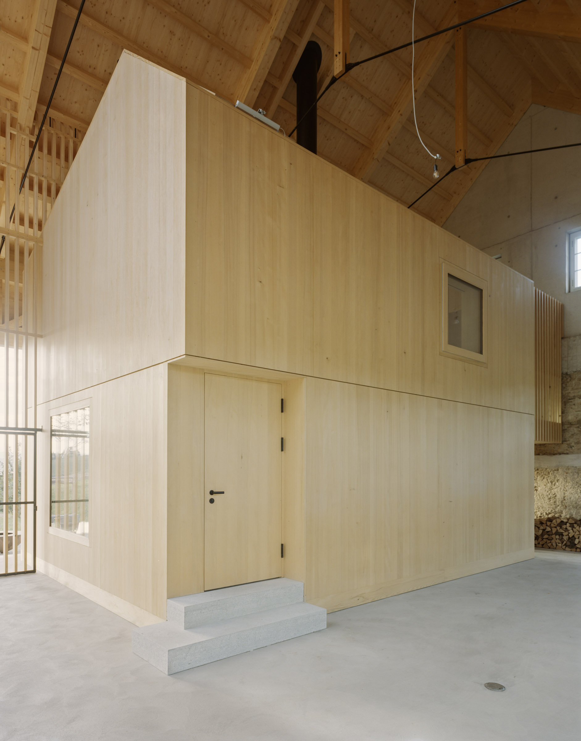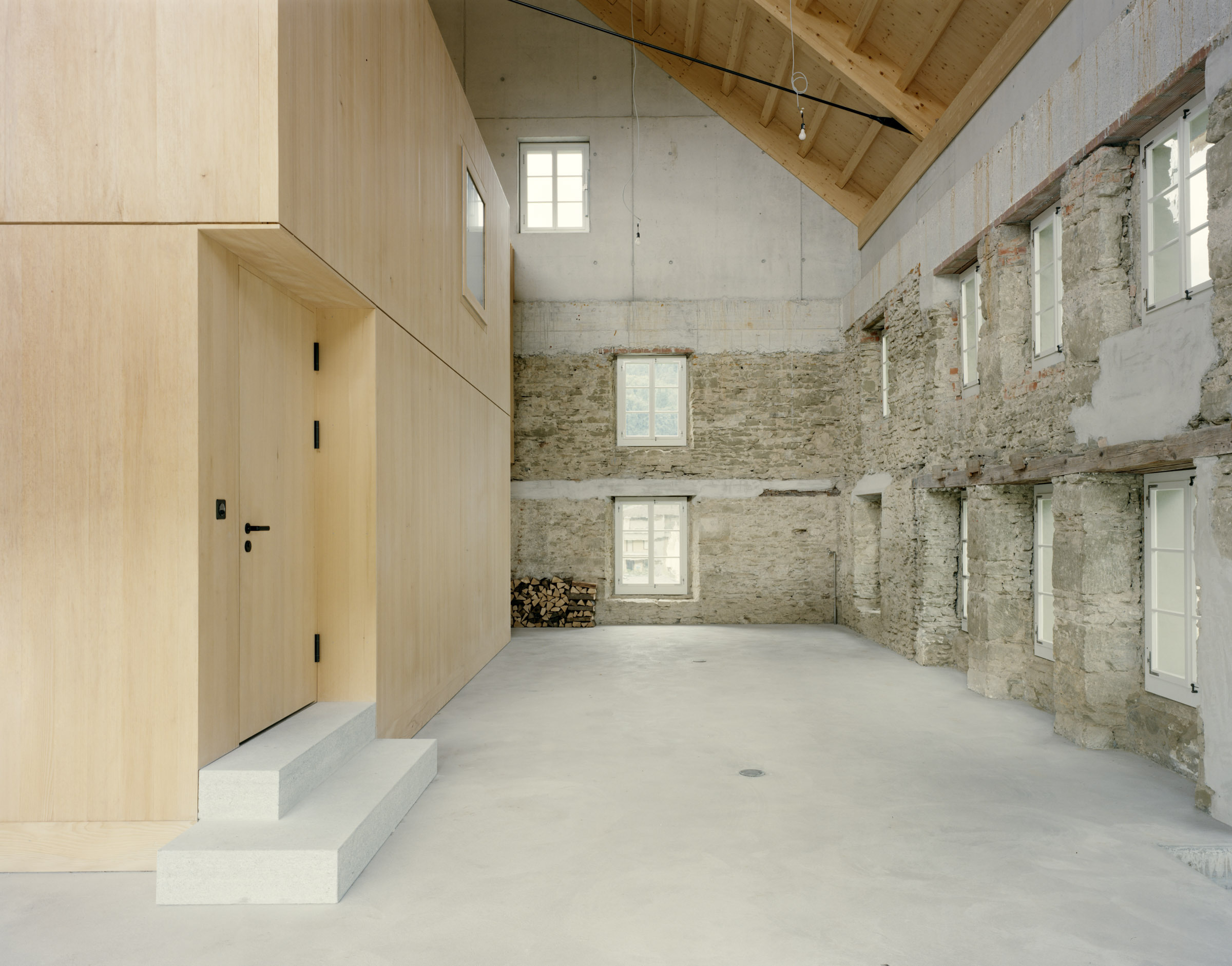 Von dem Wohngebäude bleibt die gemauerte Hülle, insbesondere die Ost- und Nordfassade, erhalten. Der dadurch freigestellte Innenraum wird zu einer Halle für ein kleines Haus – ein Haus im Haus. Auf diese Weise gelingt es, den Raum zu bewahren und die historische Bausubstanz nicht dem Abbruch preiszugeben. Gleichzeitig dient die bestehende Fassade weiterhin als Wetterschutz.