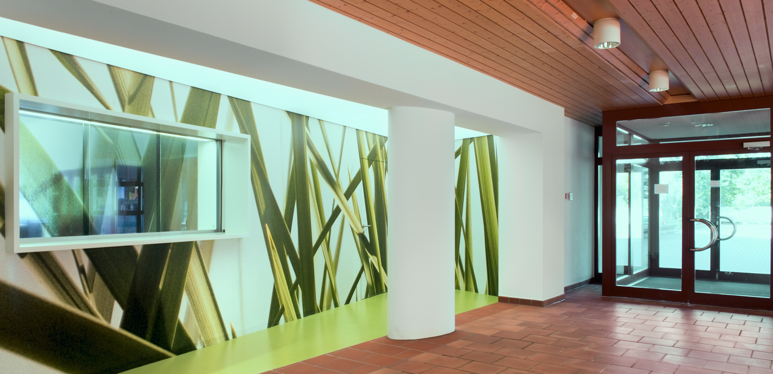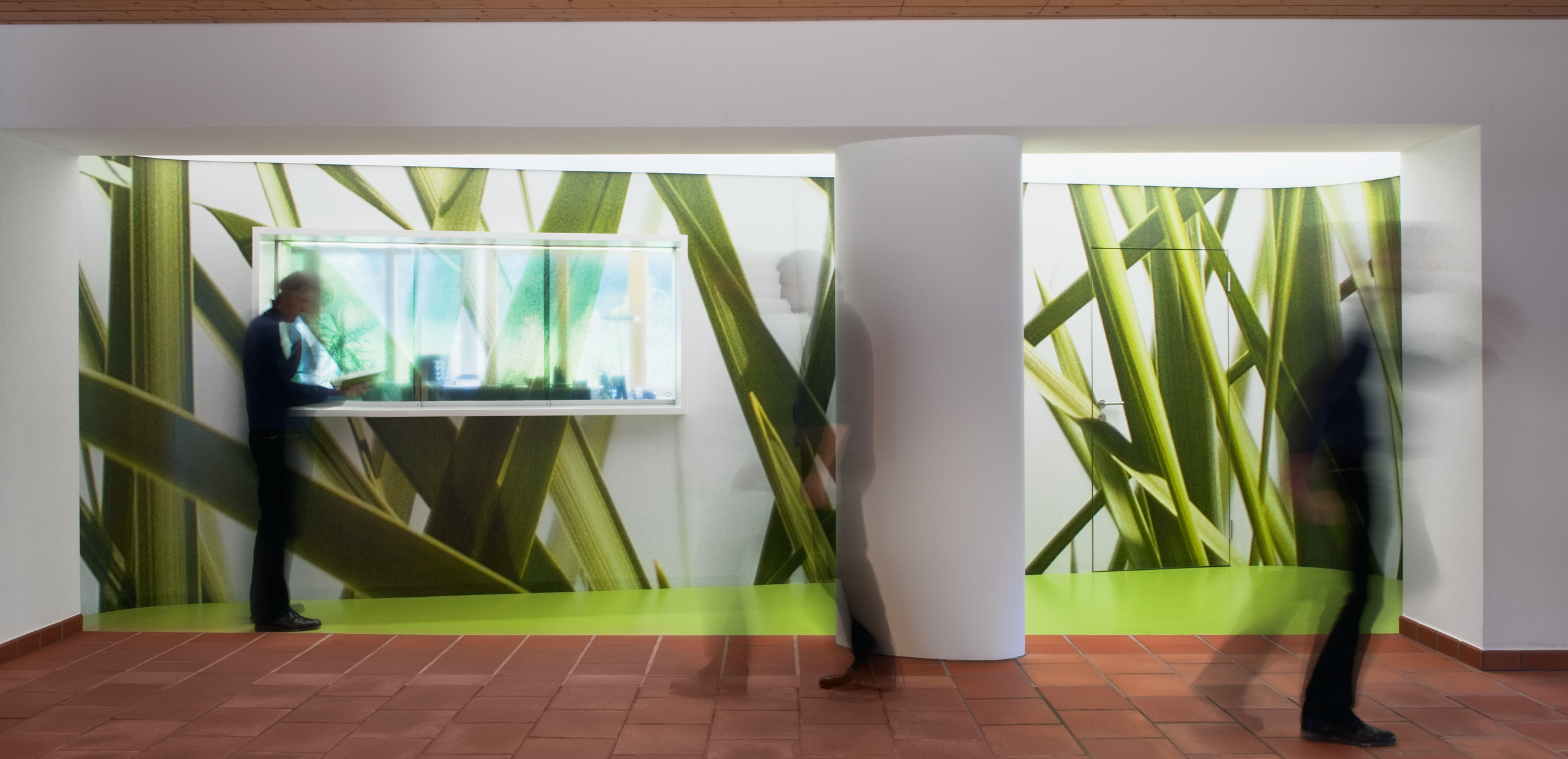 Die landwirtschaftliche Schule, typischer Vertreter der schnellen, unkritischen Architektur der 80er Jahre, kann in ihrer Gesamtwirkung ästhetisch kaum verbessert werden. Ursprünglich wünschte sich die Bauherrschaft einfach nur grössere und besser erkennbare Kundenschalter im Empfangsbereich. Nach eingehender Abklärung der Bedürfnisse haben wir zu einem spezifischen Eingriff in die Struktur des Gebäudes geraten. So entstand ein Objekt, das durch die Form und Oberflächengestaltung verschiedene Assoziationen wie Blickfang, Überraschung, Witz und die gewünschte Informationen generiert. Als in sich selbst kräftig wirkendes Element, ist es Zeichen eines neuen, frischen und dynamischen Auftritts der Schule.
