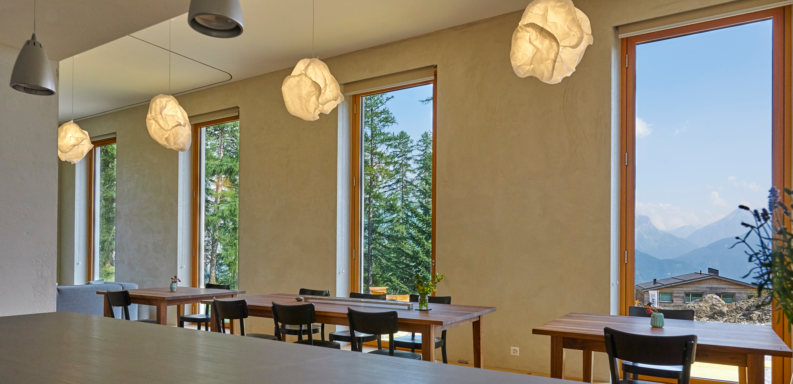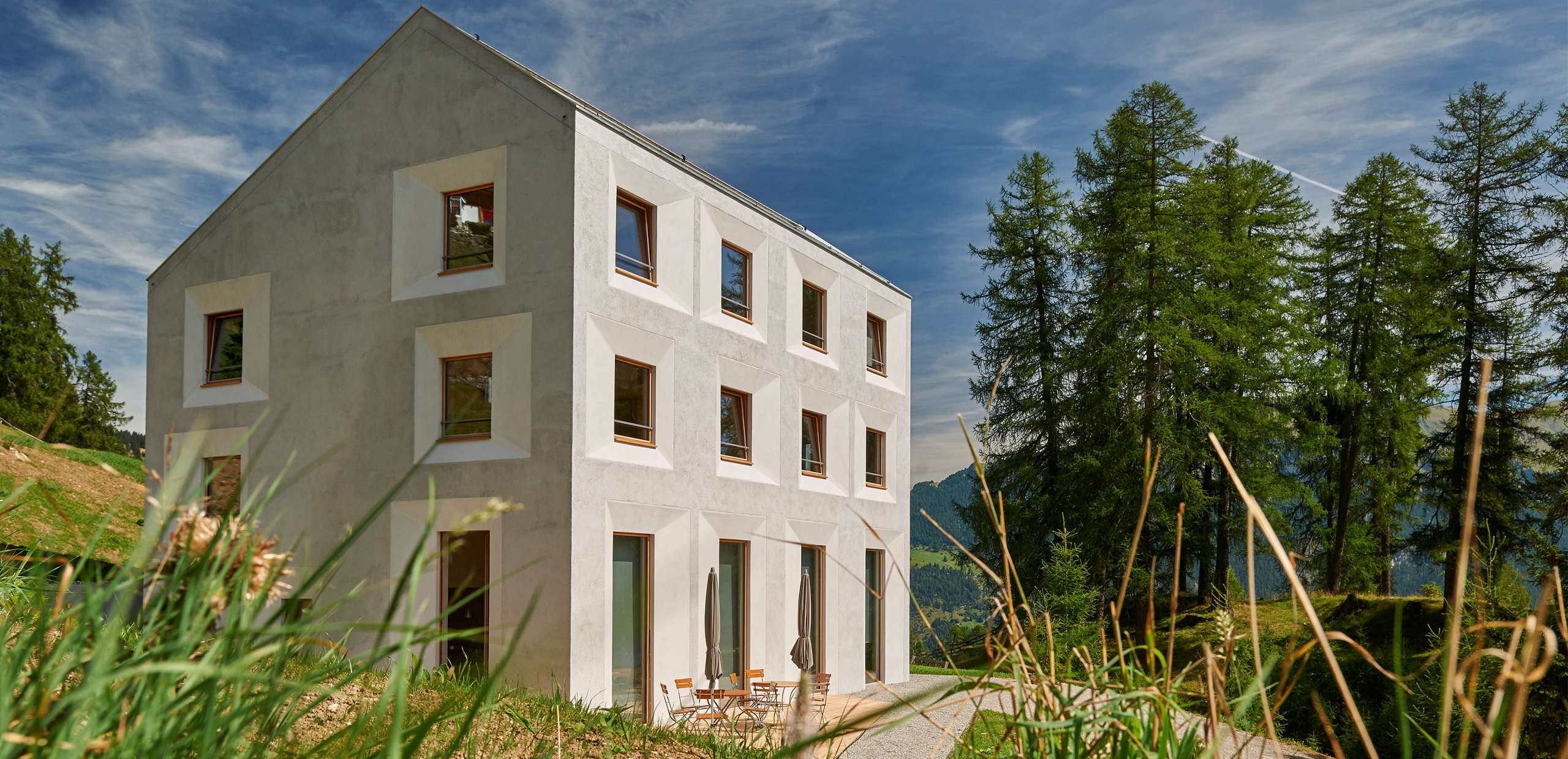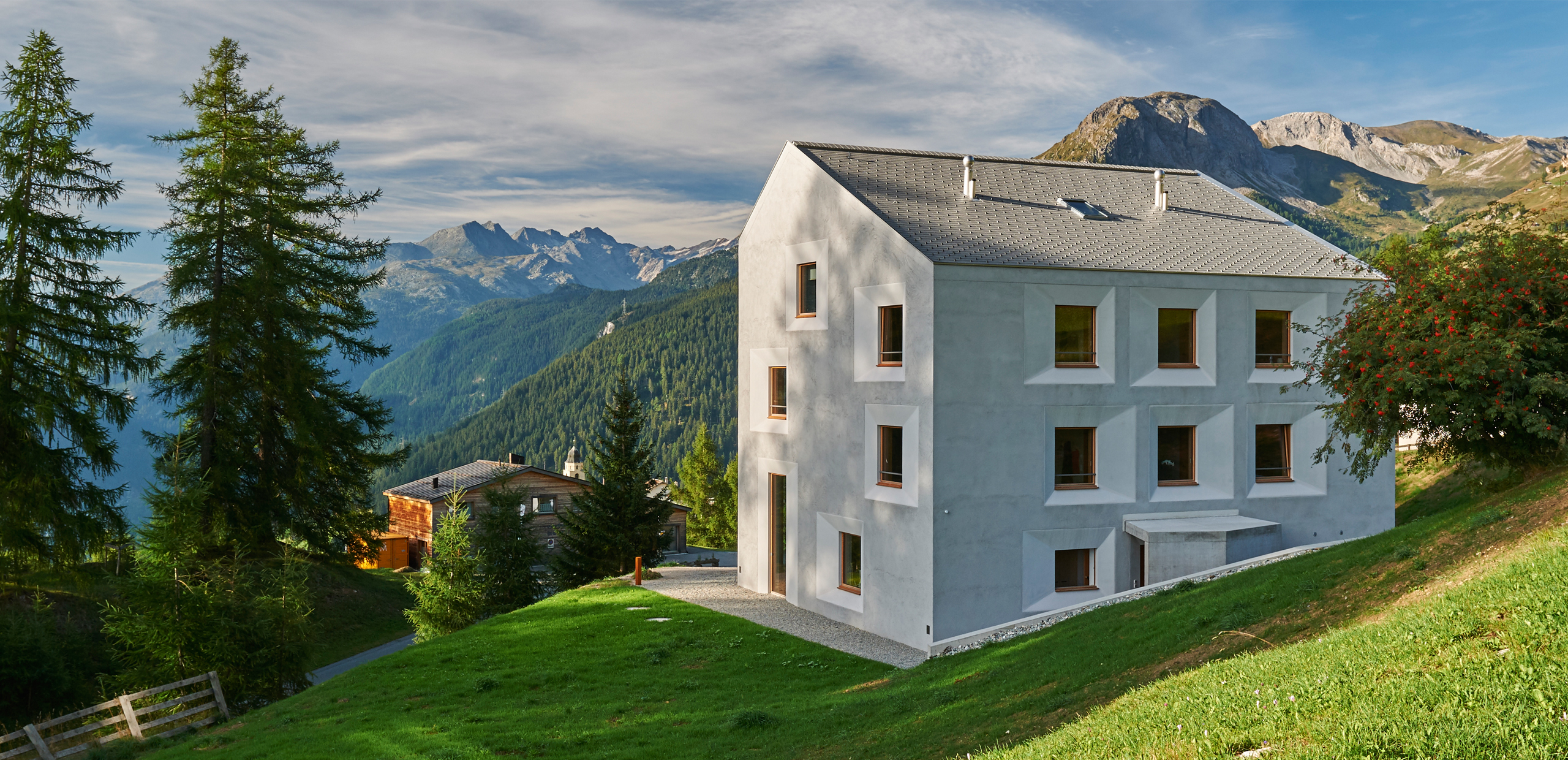 Die Pension am Rand des Dorfes Mathon entwickelten wir von innen heraus. Durch ein Minimum an Verkehrsfläche entstand ein Maximum an Wohnraum. Ohne Keller direkt auf die schon bestehende Fundamentplatte gesetzt, ist das Gebäude so ausgerichtet, dass die eindrücklichen Alpen aus allen Zimmern erlebbar sind. Ein halben Meter starkes Mauerwerk kommt ohne zusätzliche Dämmung aus und bildet so mit den regionalen, präzis gesetzten Materialien eine nachhaltige Bauweise. Das positive Raumklima ist zusammen mit der gelebten Herzlichkeit der Gastgeber ein guter Ort zum Auftanken, Geniessen und Weiterwandern.