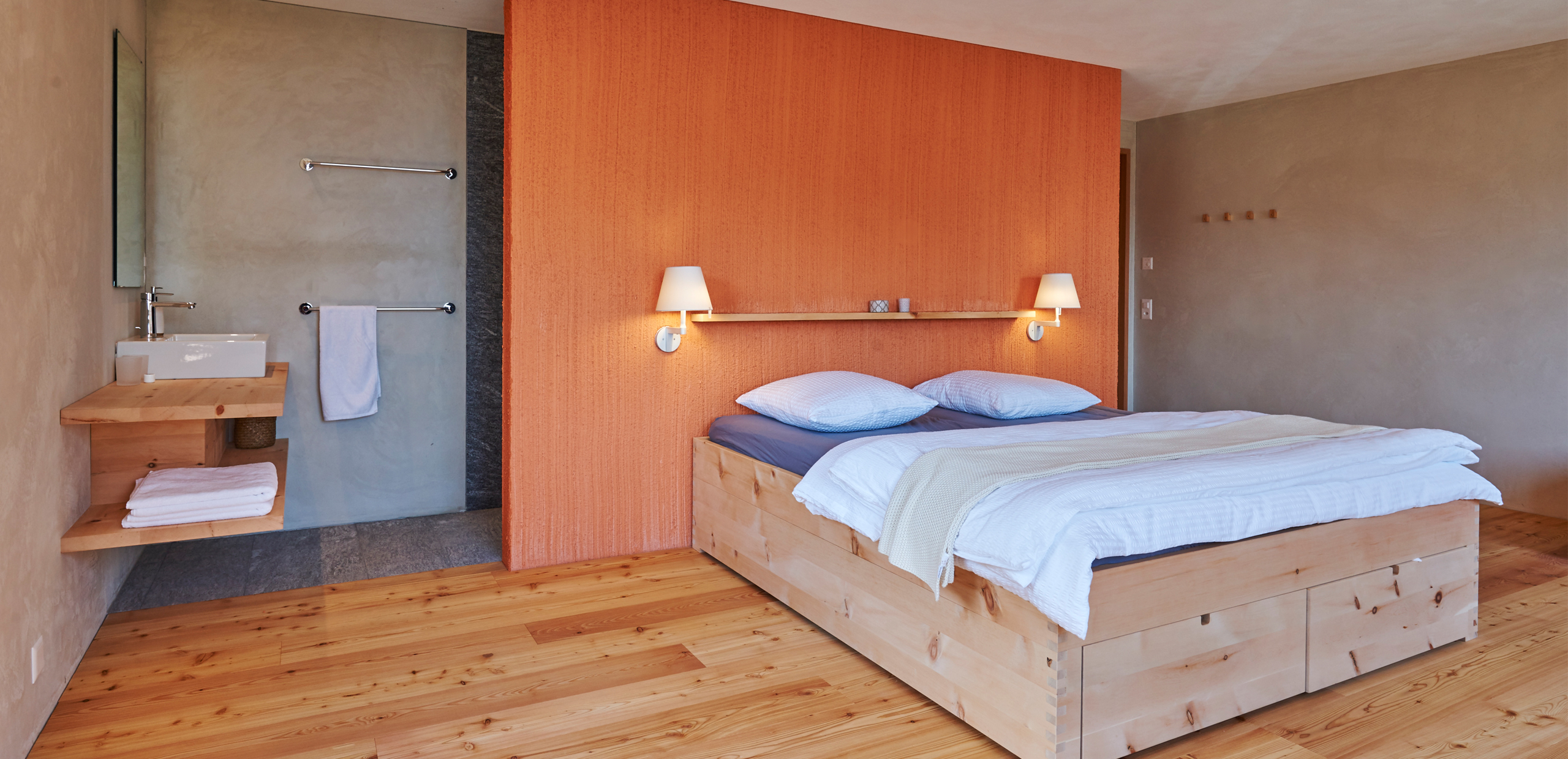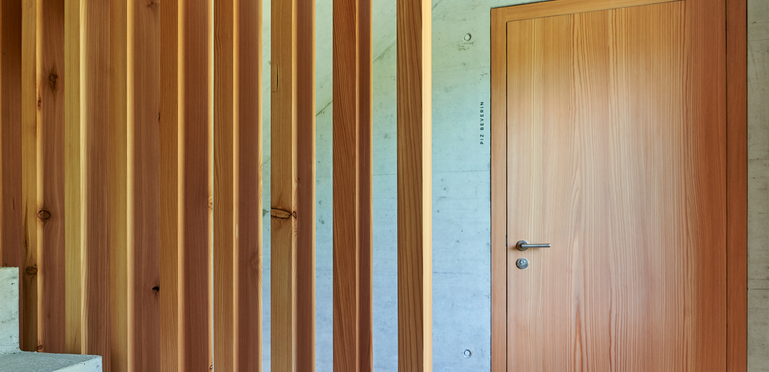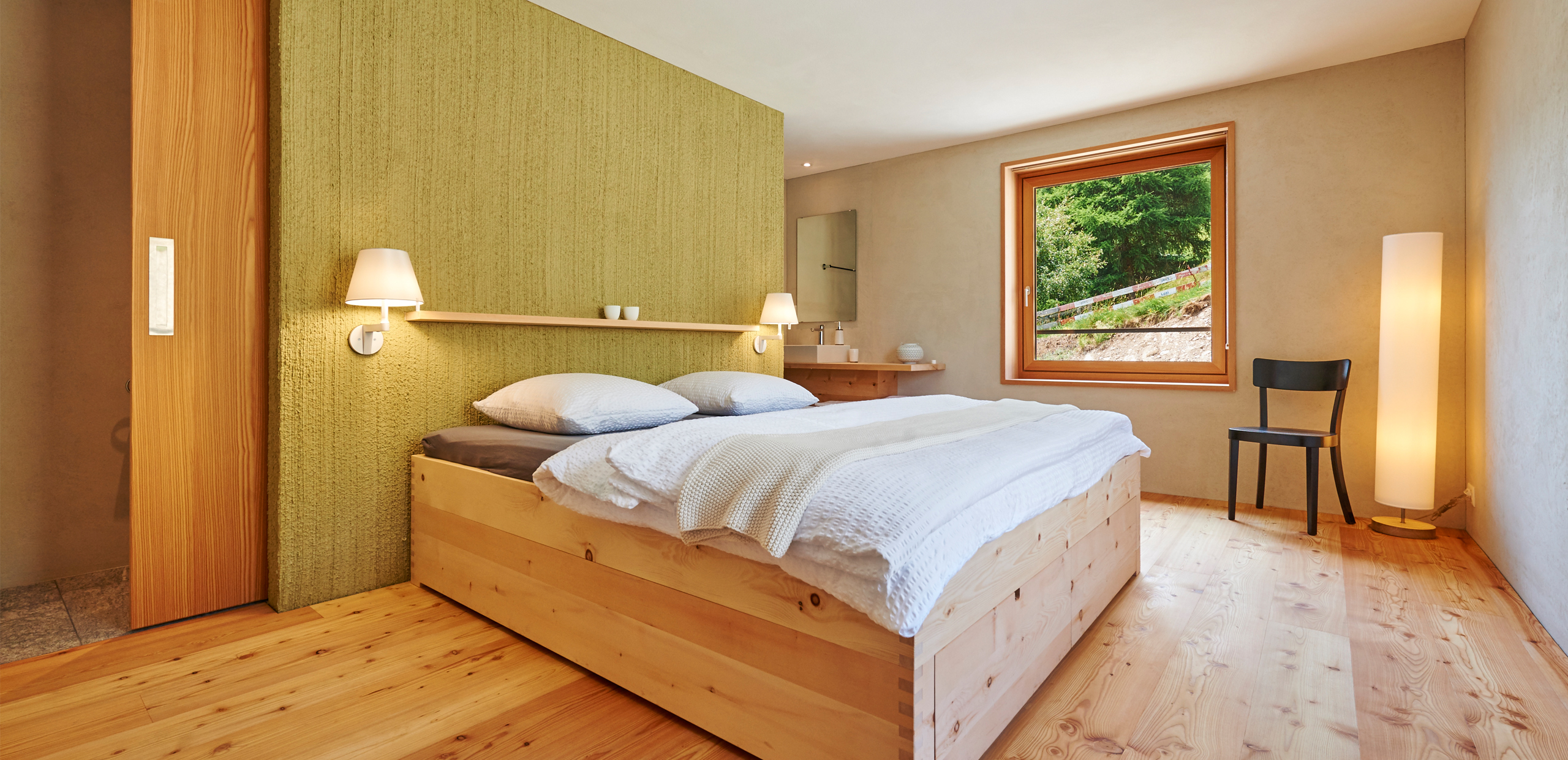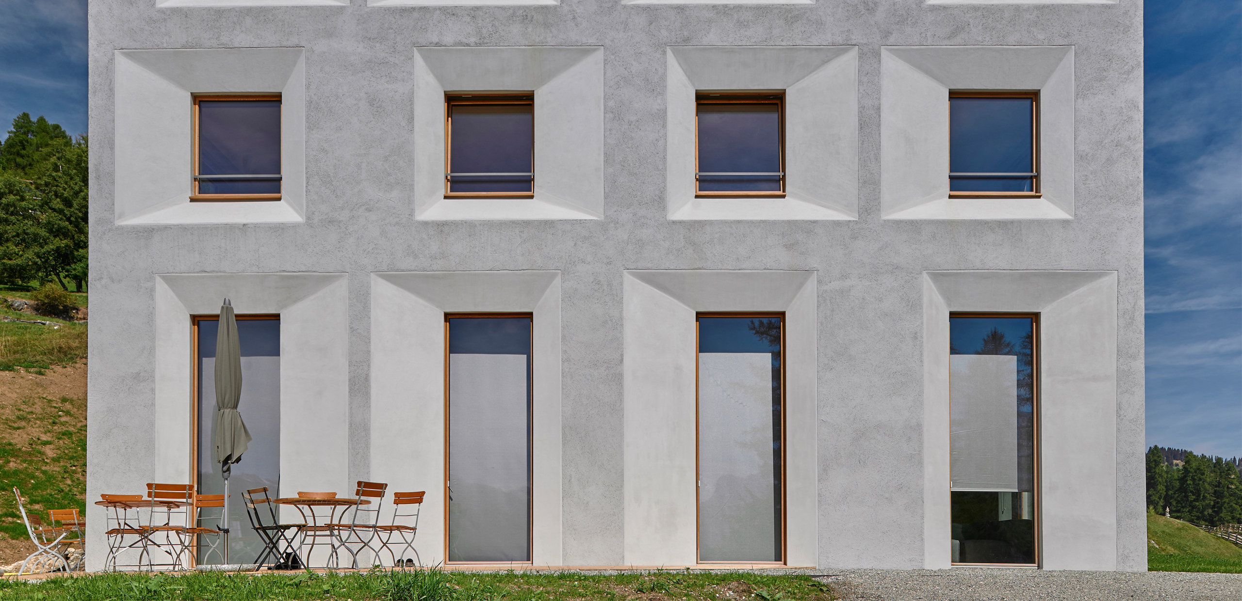 Die Pension am Rand des Dorfes Mathon entwickelten wir von innen heraus. Durch ein Minimum an Verkehrsfläche entstand ein Maximum an Wohnraum. Ohne Keller direkt auf die schon bestehende Fundamentplatte gesetzt, ist das Gebäude so ausgerichtet, dass die eindrücklichen Alpen aus allen Zimmern erlebbar sind. Ein halben Meter starkes Mauerwerk kommt ohne zusätzliche Dämmung aus und bildet so mit den regionalen, präzis gesetzten Materialien eine nachhaltige Bauweise. Das positive Raumklima ist zusammen mit der gelebten Herzlichkeit der Gastgeber ein guter Ort zum Auftanken, Geniessen und Weiterwandern.
