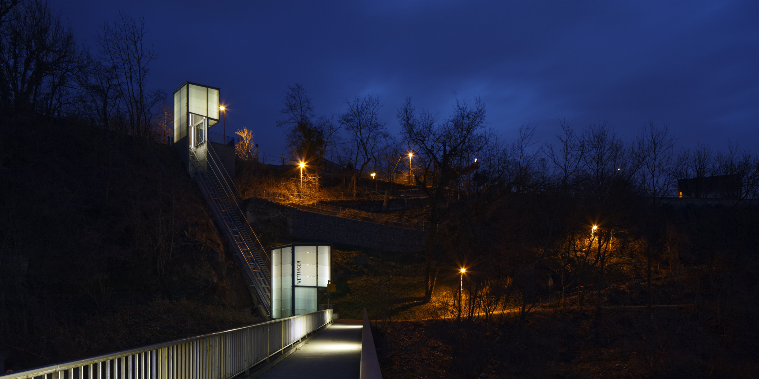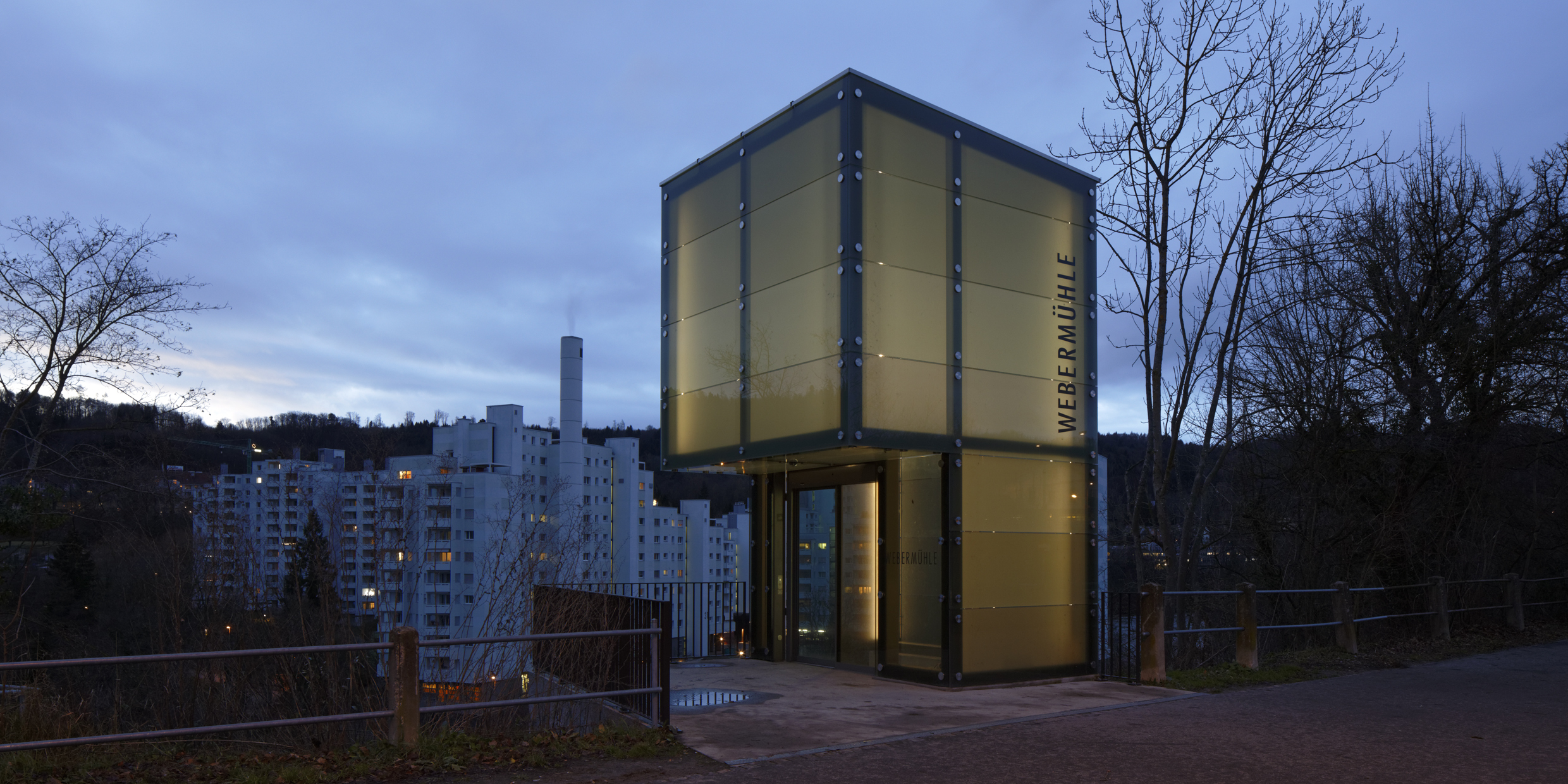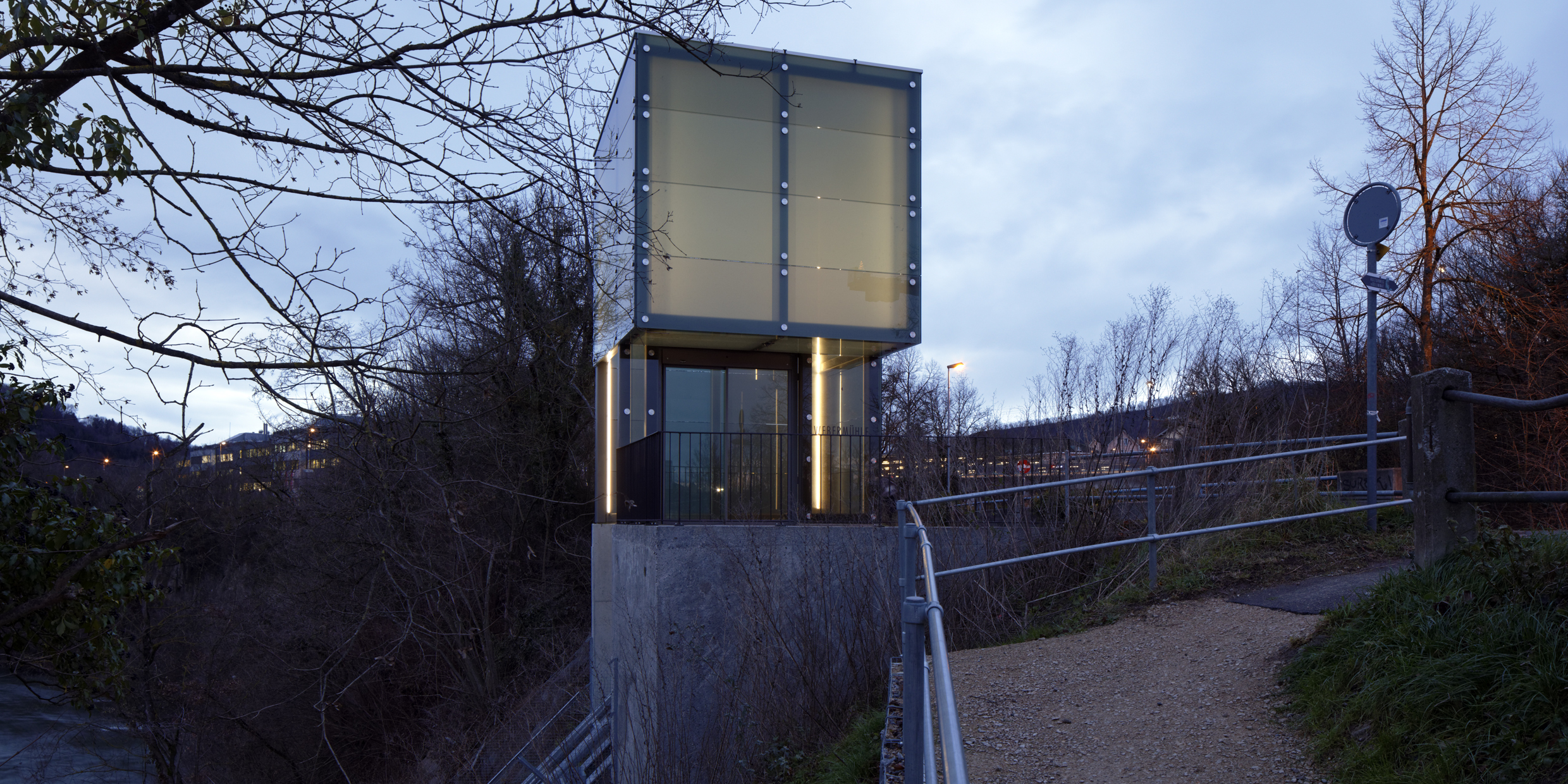 Um den BewohnerInnen der frisch sanierten Wohnüberbauung Webermühle den Zugang zum Bahnhof Wettingen zu erleichtern, haben wir einen kurzen Schräglift geschaffen. Dieser führt von der Limmatschleife hinauf und steht auch FussgängerInnen des Kulturweges zur Verfügung. Gläserne Stationen beleuchten die Zugänge und nehmen mit ihrer Gestalt und Farbigkeit die Themen der Wohnsiedlung in Neuenhof wieder auf.