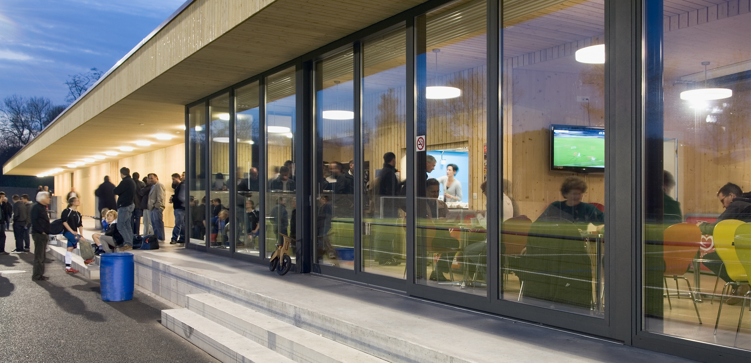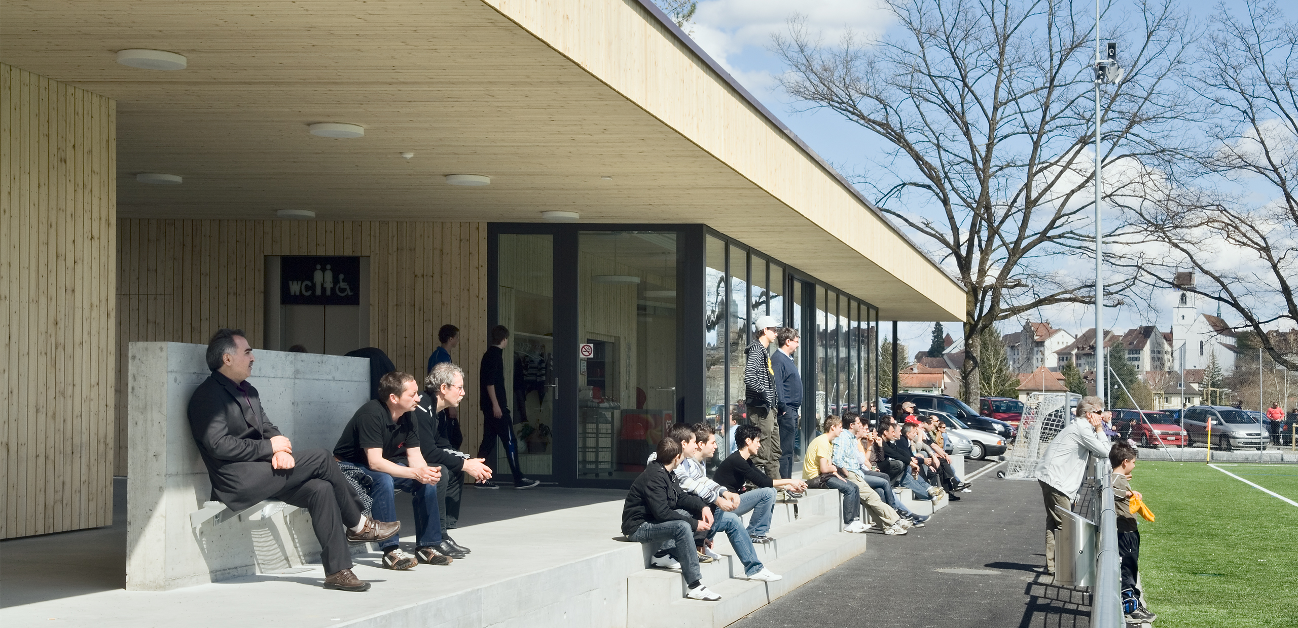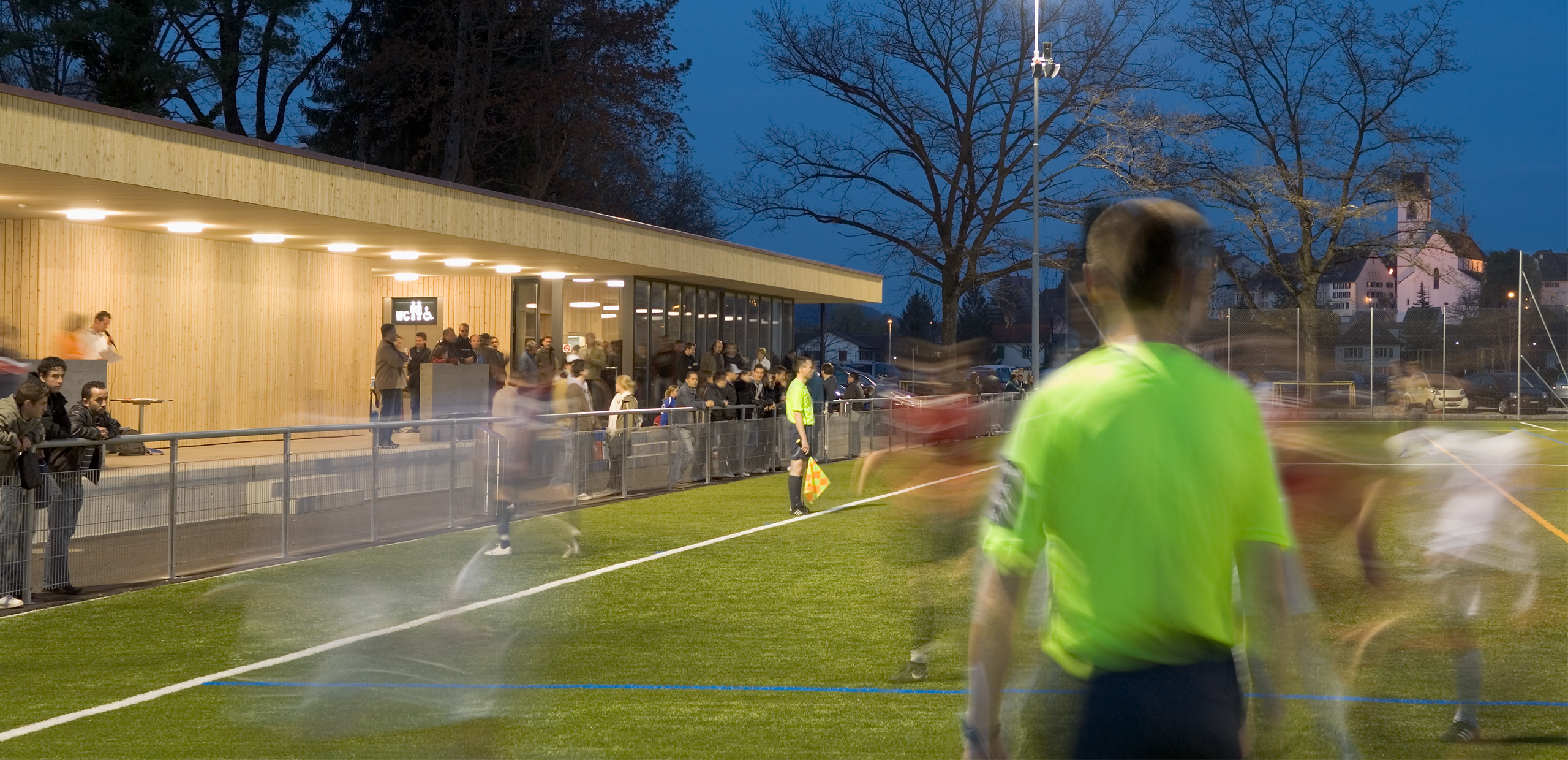 Auf einem Sportplatz soll der Sport im Mittelpunkt stehen. Eine Maxime, die wir uns bei der Gestaltung des Garderobengebäudes für den Aarauer Schachen zu Herzen genommen haben. Was nun am Rande des neuen Kunstrasenfeldes entstand, ist ein keilförmiges Gebäude, dessen Durchgänge zur Transparenz zwischen den umliegenden Sportplätzen verhelfen und das durch seine leichte Erhöhung den Fussballzuschauern einen besseren Überblick vermittelt. Das grosse Dach streckt sich über mehrere Gebäudeteile und erzeugt eine Anzahl gedeckter Aussenräume. Der reine Holzsystembau wurde vollständig in Schweizer Holz gefertigt und weist den Minergiestandard auf.