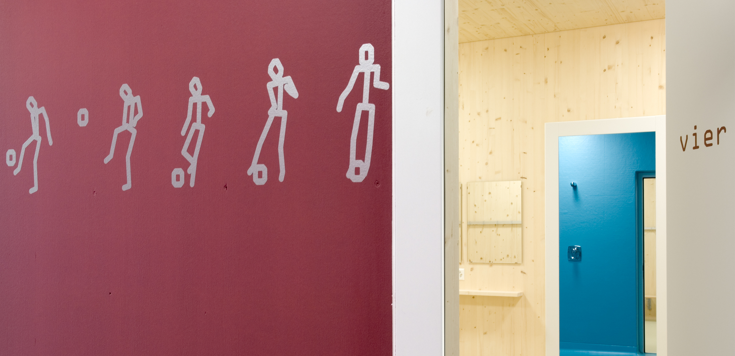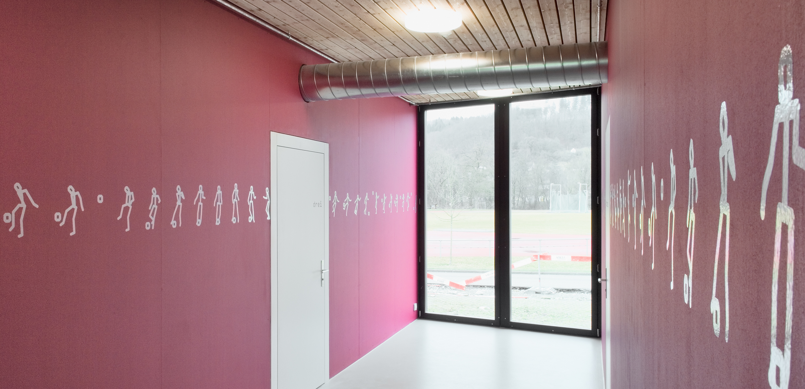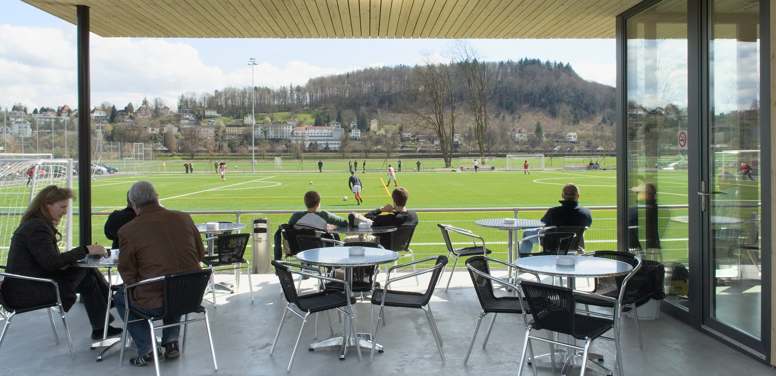 Auf einem Sportplatz soll der Sport im Mittelpunkt stehen. Eine Maxime, die wir uns bei der Gestaltung des Garderobengebäudes für den Aarauer Schachen zu Herzen genommen haben. Was nun am Rande des neuen Kunstrasenfeldes entstand, ist ein keilförmiges Gebäude, dessen Durchgänge zur Transparenz zwischen den umliegenden Sportplätzen verhelfen und das durch seine leichte Erhöhung den Fussballzuschauern einen besseren Überblick vermittelt. Das grosse Dach streckt sich über mehrere Gebäudeteile und erzeugt eine Anzahl gedeckter Aussenräume. Der reine Holzsystembau wurde vollständig in Schweizer Holz gefertigt und weist den Minergiestandard auf.